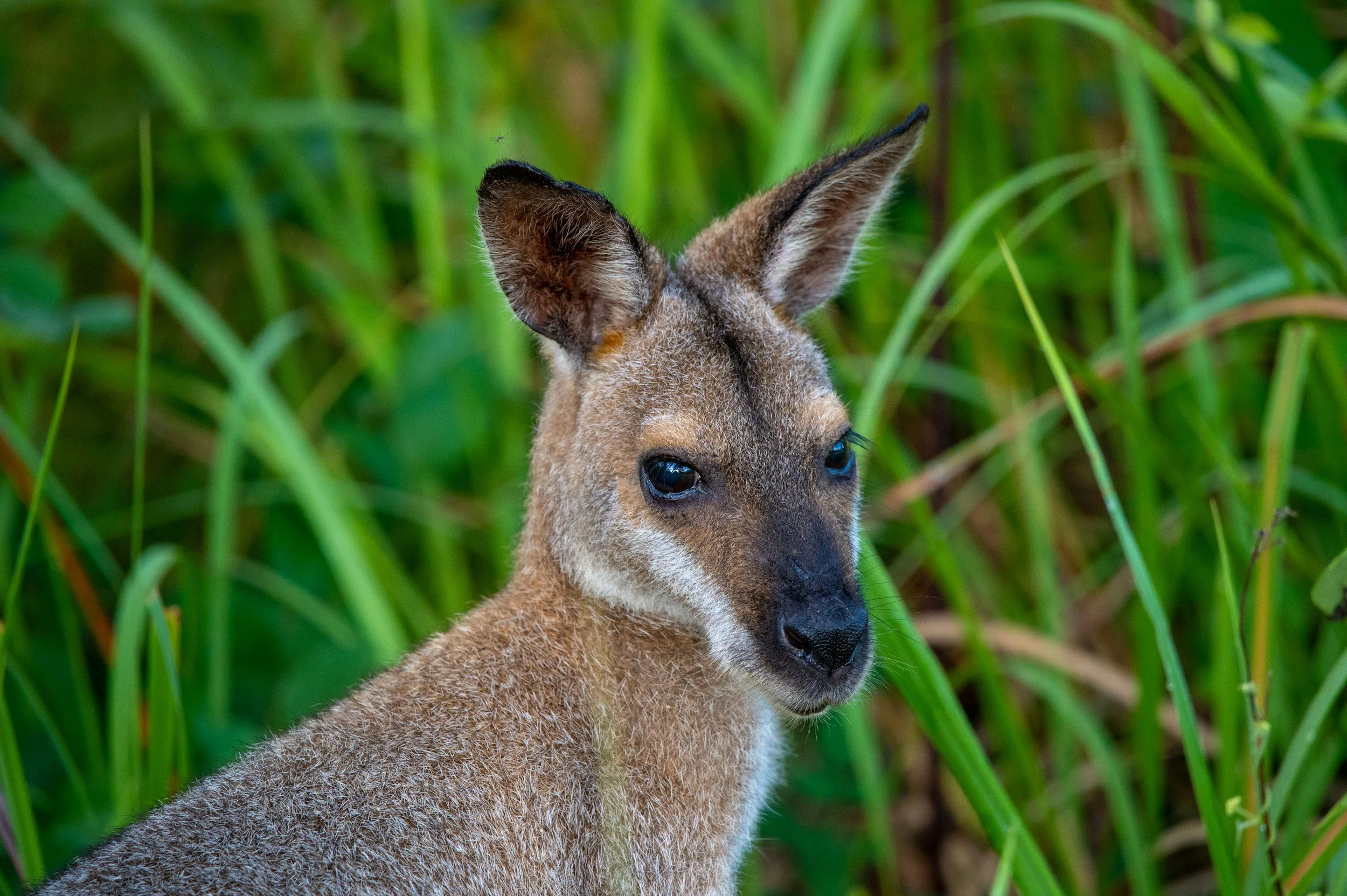 Close-up of a young animal, possibly a fox or coyote, with large ears and dark eyes, in lush green grass.